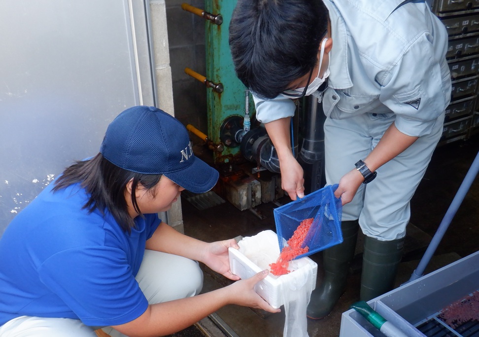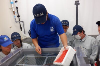 この日は、海洋科2年生資源コースの10名が富山県農林水産総合技術センター水産研究所(滑川市高塚)で総合実習を行いました。全9回に渡る実習の最終回は、サクラマスの生態やALCと呼ばれる薬品に染まった稚魚の耳石を取り出し観察する、その技術や方法を楽しく学びました。正午前には実習を終えて、卵の受け渡しを済ませて学校に戻ります。