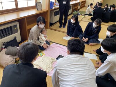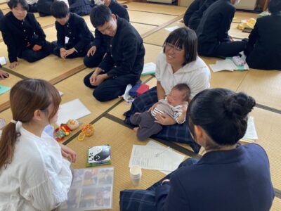 令和7年11月5日~7日に2学年家庭総合で赤ちゃんふれあい体験を行いました。各日5組の親子に講師として参加していただき、グループに分かれて、出産や子育てについてお話を聞いたり赤ちゃんとふれあったりしました。講師のお母さんからリアルなお話しを聞くことができ、ライフプランや子育てについて考えるよい機会となりました。ふれあい体験の最後に、グループのメンバー全員で作製した布おもちゃをプレゼントしました。