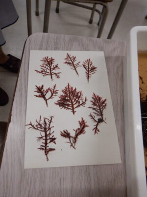 また、藻場の観測に用いる器具の解説や、実際に海藻を使った標本作成の実習も行われました。神谷教授がご持参された作成キットをもとに、生徒たちの前で実演していただくことで、参加者はより実践的な知識を深めることができました。