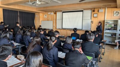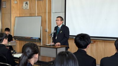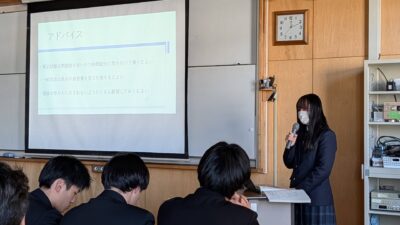 校長先生の挨拶のあと、就職内定者が筆記試験や面接の内容を説明し、1,2年生にアドバイスを送ります。