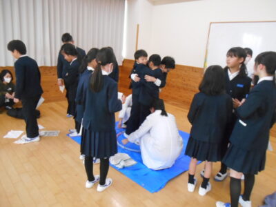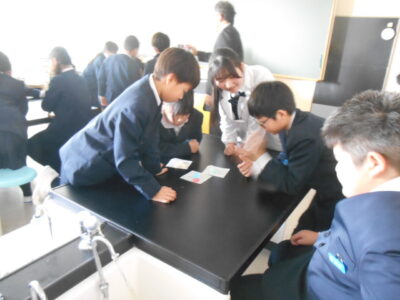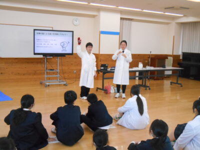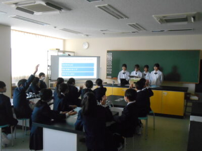 1月21日(水)薬業科3年生12名による「出前授業」が滑川市立田中小学校5年生を対象に行われました。今年で7回目となる本行事は、本校薬業科の課題研究で取り組んだ題材を、地元の小学生に発表し、体験してもらうことで、科学や薬業に興味をもってもらうことを目的としています。