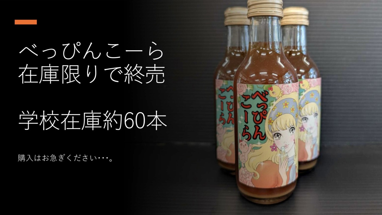 【薬学部】べっぴんこーら終売について 2026.04.07 みなさまにご愛顧いただいた、べっぴんこーら。 在庫限りで終売となりました。 再生産の予定はありません。 校内在庫約60本。 4月・5月のマルシェでの販売が最後となりそうです。 見かけたら、ぜひご購入を。