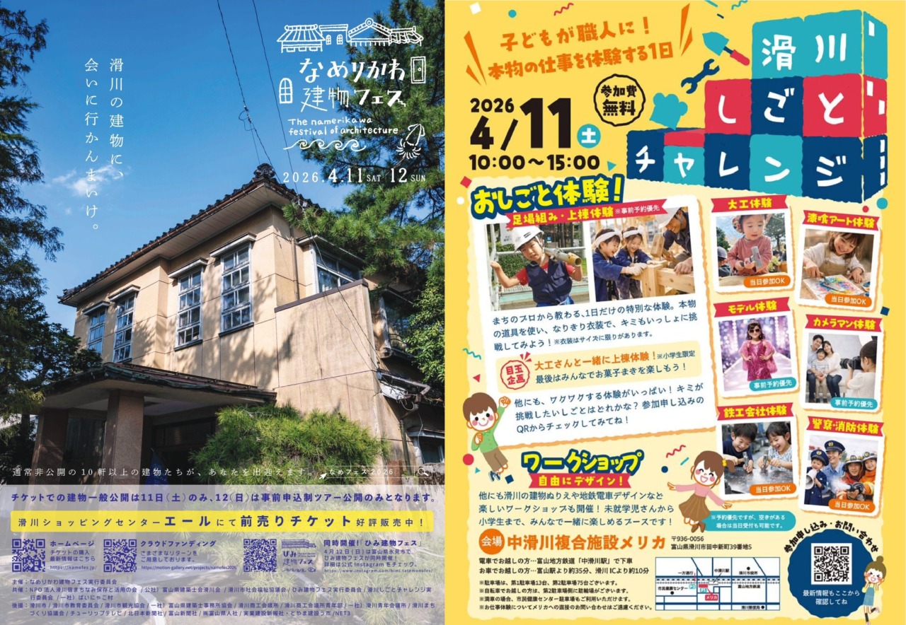 4月11日(土)、12日(日)開催のなめりかわ建物フェスと11日(土)開催の滑川しごとチャレンジに、本校の生徒がボランティアで参加しました。