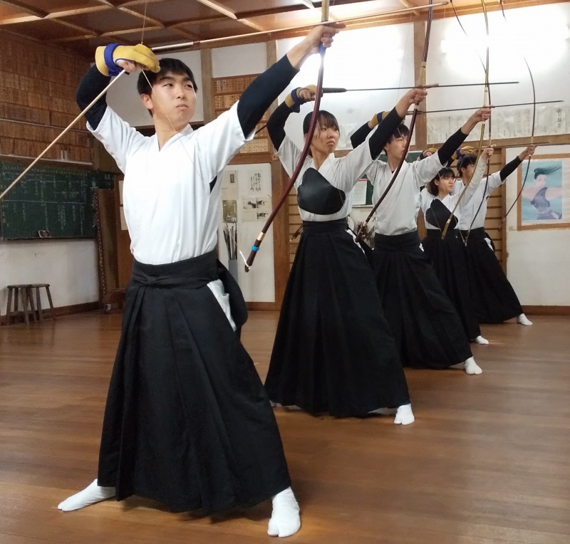 学校の敷地内にある弓道場で活動しています。ほとんどの人が初心者で入部し、基本から身に着けていきます。令和元年に創部60年を迎え、諸先輩方の栄光の記録を超えようと、北信越大会や全国大会に出場するだけでなく、入賞を目指して、日々精進しています。